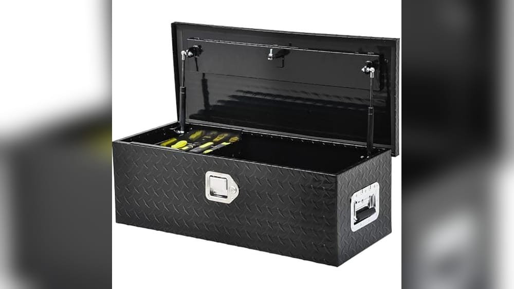 This toolbox is made from heavy-duty aluminum with a diamond plate design for strength and durability. It keeps tools organized and dry, even in tough conditions. Many models include sliding shelves for easy access and better storage. The lock ensures your valuables stay safe on job sites or trips.