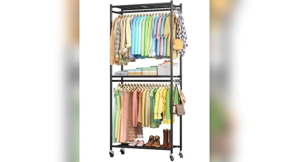 This portable clothes rack by HOMIDEC features a robust steel frame that guarantees stability while maintaining a modern aesthetic. The inclusion of four tiers of shelves offers versatile storage options, making it easy to keep shoes, hats, and folded items neatly arranged. Meanwhile, the hanging rods provide sufficient space for hanging clothes, helping users keep their garments wrinkle-free and readily accessible. This combination of shelving and hanging space makes it a highly functional organizer suitable for any room.